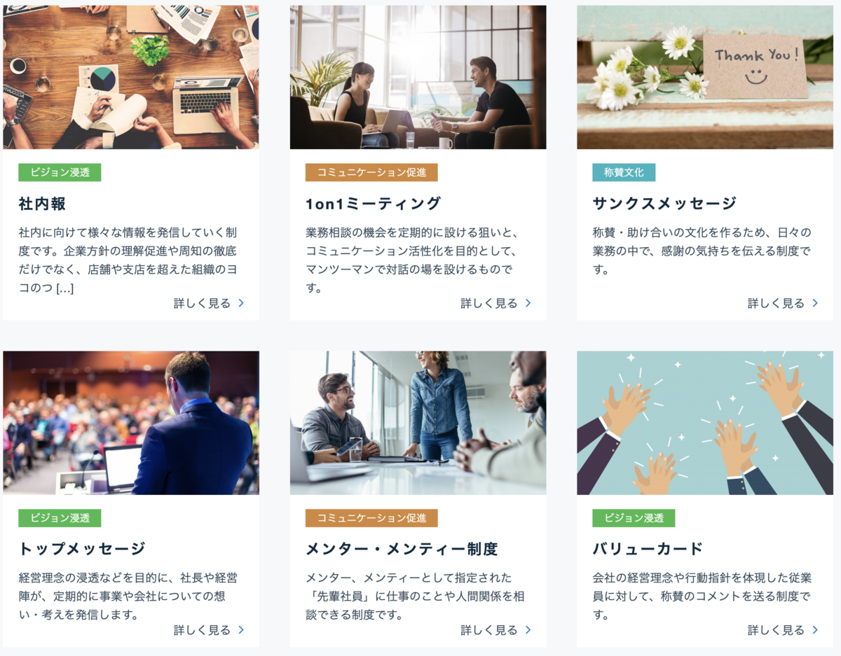 「社内制度」は、サンクスカードや社内報、1on1ミーティングなど、会社ごとの経営方針や組織課題に合わせてさまざまな形で運用されており、その種類は多岐に渡ります。TUNAGではこれらの社内制度をアプリケーション上で利用することができ、その利用結果がタイムライン上にフィード形式で投稿され、会社全体に共有することができる仕組みになっています。
