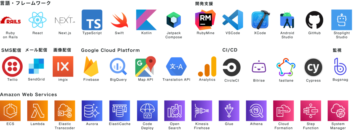 Amazon ECS上のDockerコンテナで実行された、モノリシックなRailsアプリケーションを中心としたシンプルな構成になっています。データベースにはAmazon AuroraやAmazon ElastiCache、Amazon S3、そして全文検索エンジンとしてはAmazon OpenSearch Serviceを利用しています。CI/CDにはCircleCIを利用しており、RSpecやJestによる単体テスト、そしてCypressによるE2Eテストを実施した後にデプロイをしています。プロダクトのコアな価値以外のシステム(メール・SMS・プッシュ通知・画像配信基盤など)には積極的にSaaSを活用し、開発・運用コストを圧縮しています。