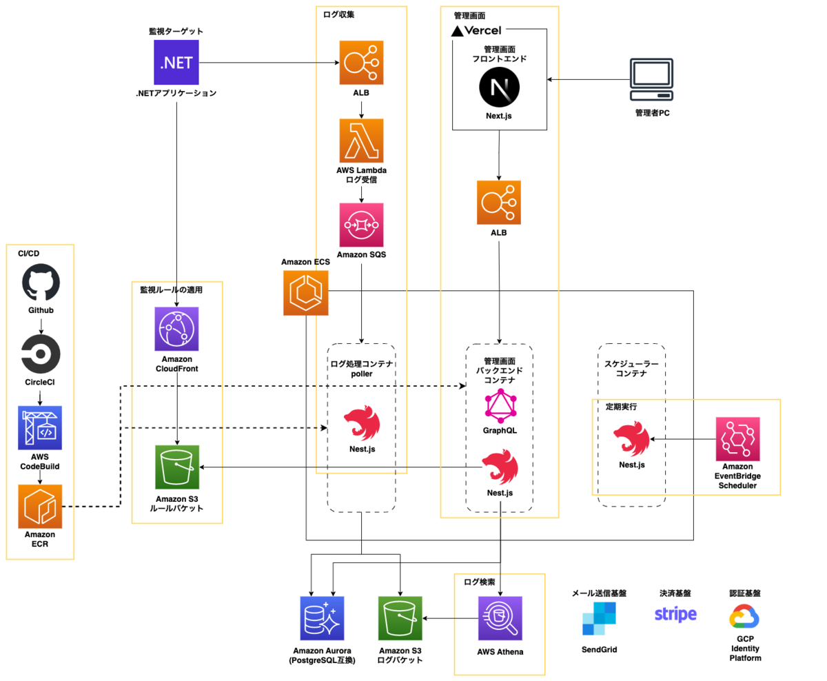 ログの保存・閲覧用のWebアプリケーションの開発には、バックエンドフレームワークとしてNest.js、フロントエンドフレームワークとしてNext.jsを使用しています。SPA構成となっており、フロントエンドとバックエンドの間のインターフェースにはGraphQLを採用しました。 クラウドはAWSをメインとし、一部基盤としてGCPやその他SaaSを利用しています。AWSの開発・管理にはAWS CDK in TypeScriptを使用しています。
