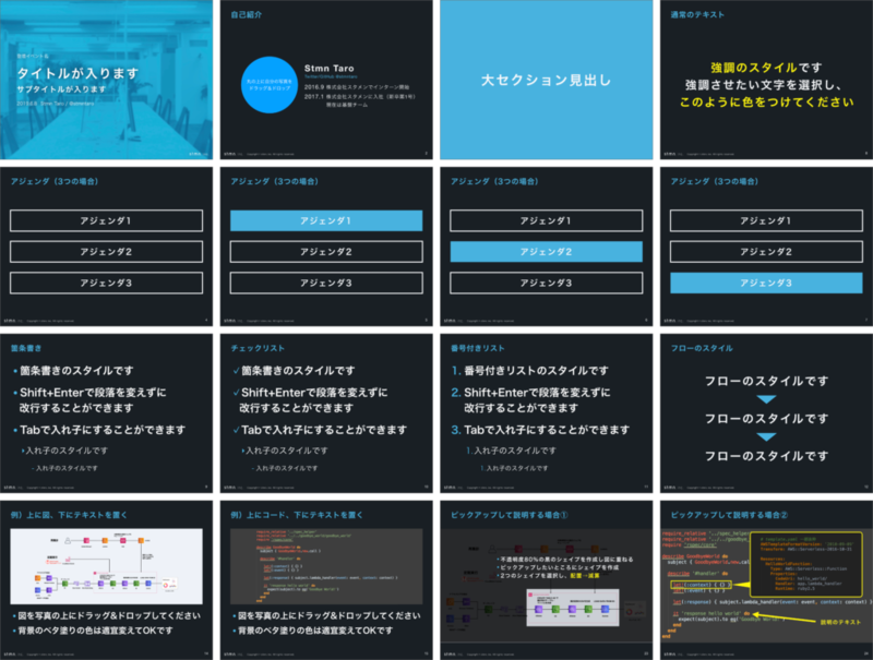 上記を達成するために、スタメン共通の登壇資料テンプレートを作成することにしました。